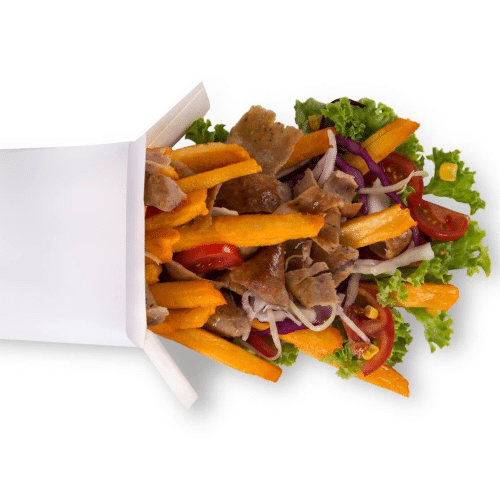 z surówką firmową i sosem do wyboru lub w rozmiarze XXL z sałatą lodową, ogórkami, pomidorami, papryką, cebulą i sosem